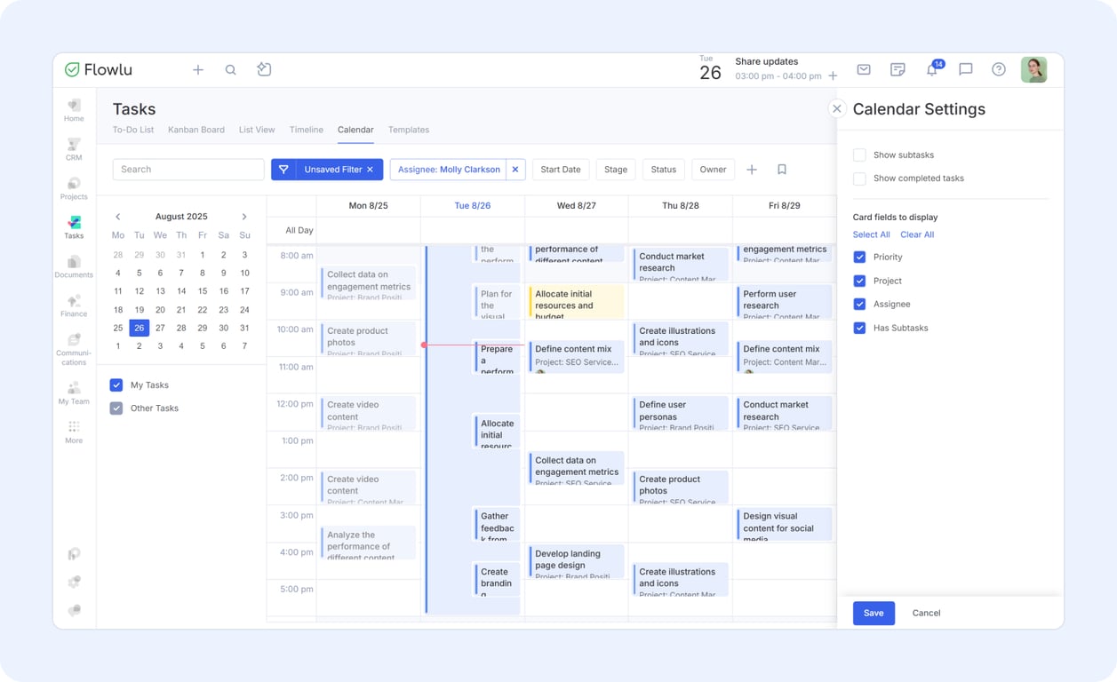 One of the most requested features in Flowlu is finally here: you can now view your tasks on a calendar. Managing deadlines and coordinating your team’s workload is now more straightforward. With tasks laid out by day, week, or month, it’s easy to spot gaps, avoid overlaps, and keep everything moving on schedule.