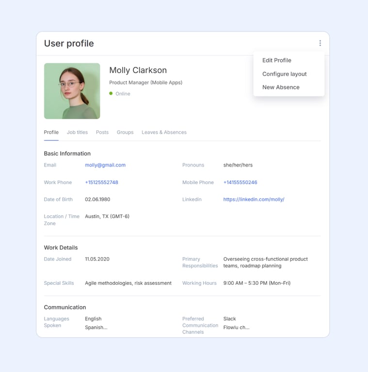 This makes it easy to record time zones, preferred contact methods, working hours, HR details like start dates, emergency contacts, uniform sizes, and more — all in one place.