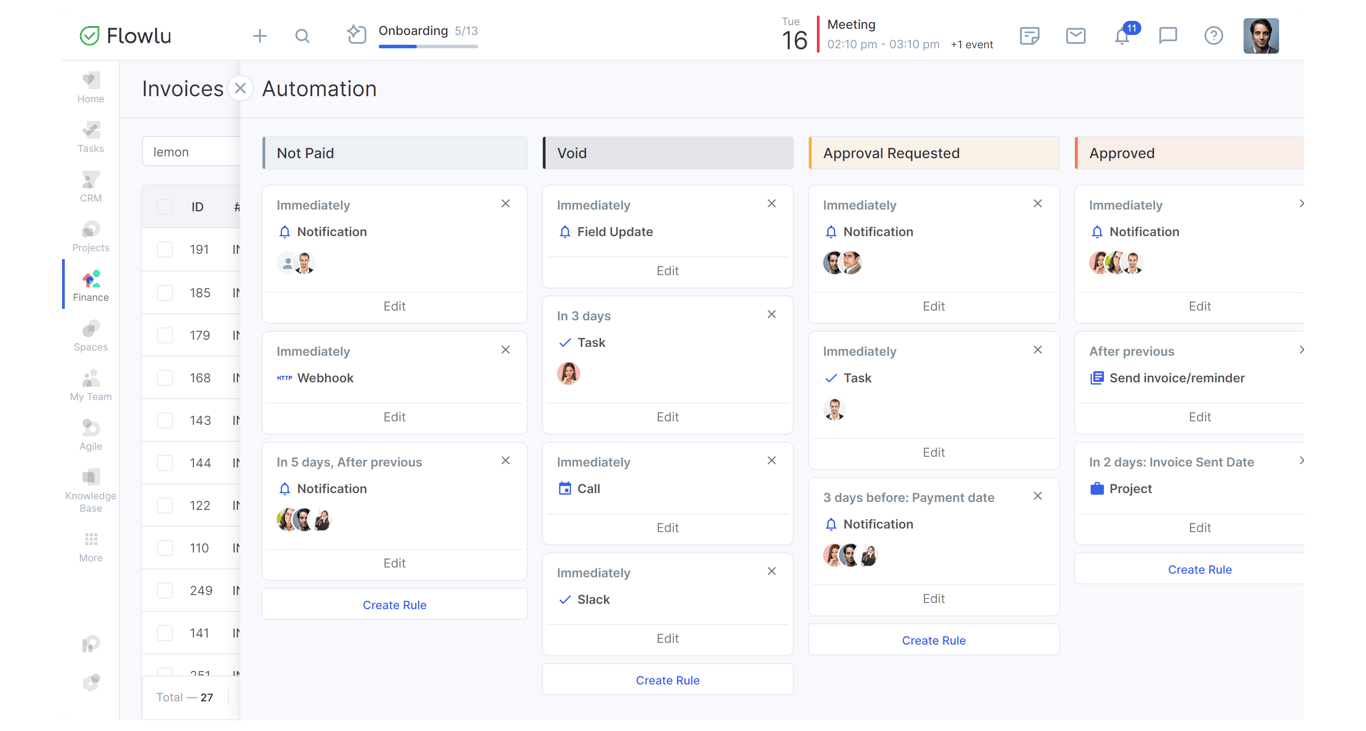 Let’s say you want to get alerts when your employees issue an invoice greater than $5,000 or re-assign an invoice for a top customer to another salesperson. Or, even schedule a call with a client once your invoice is partially paid. You can now easily achieve this with Flowlu automation for invoices!Â