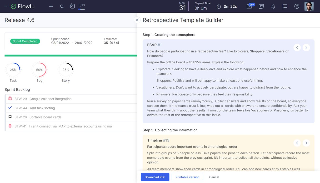 With our new Agile feature, you can try a variety of pre-made scripts to run a successful retrospective meeting. Reflect with your team on the previous iteration to build a better workflow for the upcoming sprint.Â
