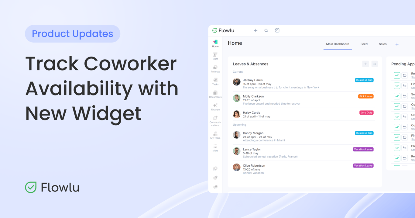 Stay in the loop with the all-new Leaves & Absences widget, now available on your Flowlu dashboard. Pin it and get a quick glance at your team's upcoming time off—because knowing who’s out of the office just got easier. You’ll immediately see which teammates might be slower to respond or unavailable, plus you’ll know the why behind it. Perfect for scheduling those urgent tasks or meetings before someone heads off for their well-deserved break!