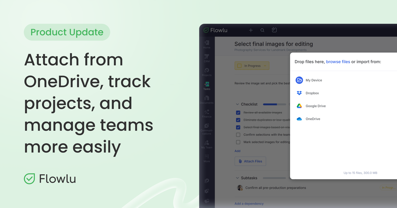 You can now attach files directly from your OneDrive account to tasks, projects, contacts, and more in Flowlu. You can either link to the file without using your Flowlu storage or save a local copy, which will count toward your storage limit.