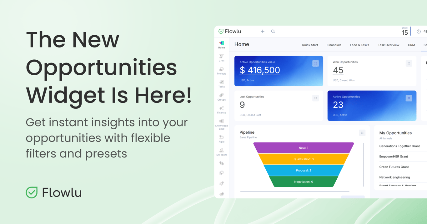 Say hello to the new "Opportunities" widget for your dashboard! This handy tool lets you display the total value or number of opportunities at a glance.