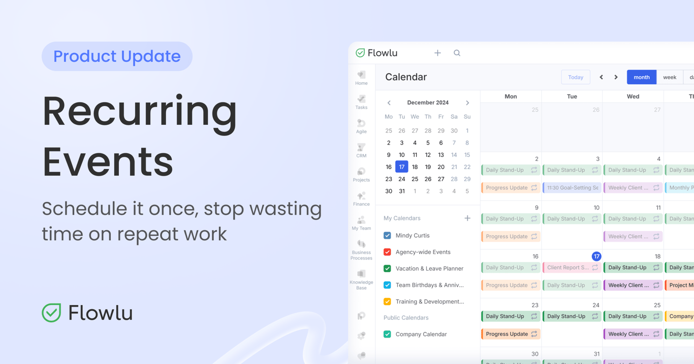 No more manual work. Just set it once, and Flowlu keeps your calendar up to date, so you can focus on the meetings themselves—not on recreating them. Recurring events appear directly on your calendar, so you always know what’s coming up!